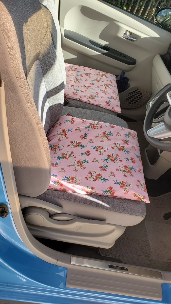 まず、年末年始休みから取り組んでいたのが車の座布団カバー作り。運転席と助手席用の小さい座布団カバー、後部座席用の長座布団カバーをそれぞれ作りました。