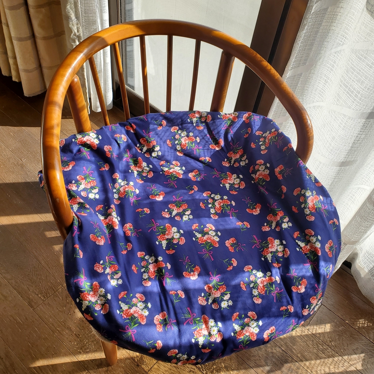 他にも、自室用に丸い座布団のカバーを作りました。こちらは車用の座布団カバーの色違いで、紺地です。落ち着いた色調で気に入っています。写真では光の加減で紺色が明るく見えます。