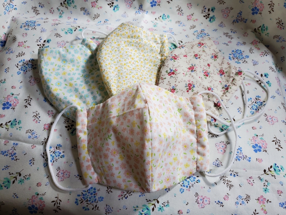 布マスクも手作りしています。こちらはすべて手縫いです。市販の不織布マスクがどうも肌に合わず、コロナが流行り始めてマスク自体が入手しづらかった頃から布マスク作りを始めていました。もう今までに20枚ぐらい作ったでしょうか。使っているうちに布が傷んだり色褪せたりするので時間のあるときに作っています。
